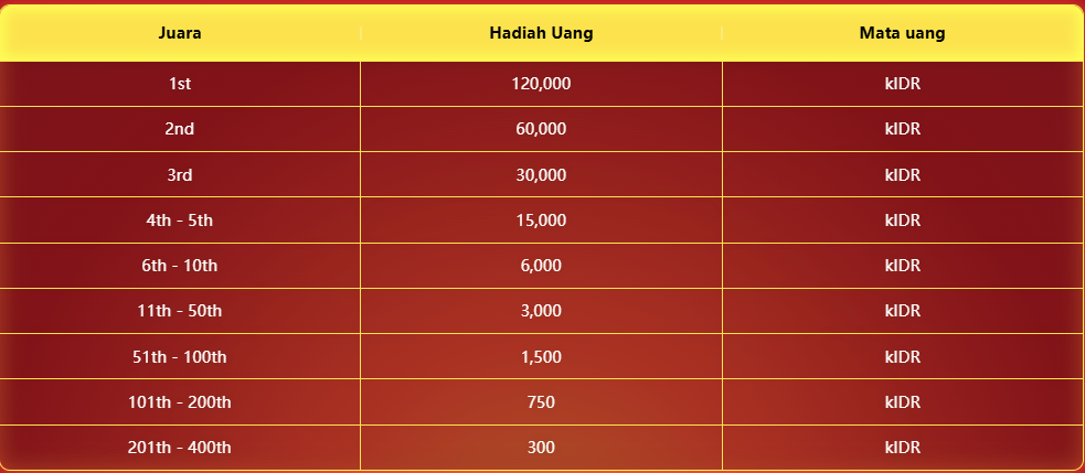 7. Hadiah Turnamen dengan total hadiah senilai IDR 600.000.000 yang akan dibagikan selama periode promosi.