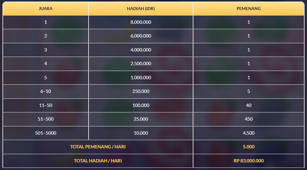 2. Total hadiah Rp 2,6 MILIAR akan dibagikan kepada 5.000 pemain setiap hari selama periode promo berlangsung.