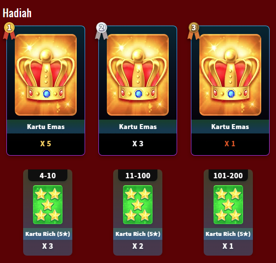 7. Jika ada dua atau lebih pemain dengan skor kemenangan yang sama, pemain yang terlebih dahulu meraih skor tersebut akan berada di posisi yang lebih tinggi di papan peringkat.